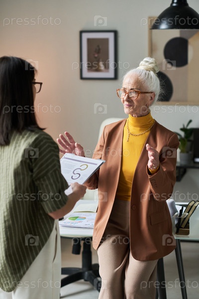 Портрет старшей женщины, держащей документы на деловые встречи