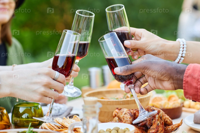 Тост за красное вино на групповой вечеринке в открытом воздухе