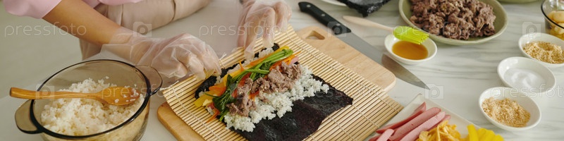 Домашняя хозяйка готовит корейский кимбап дома