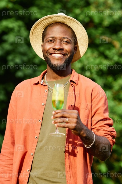 Улыбающийся мужчина держит напиток, нося шляпу и ожерелье