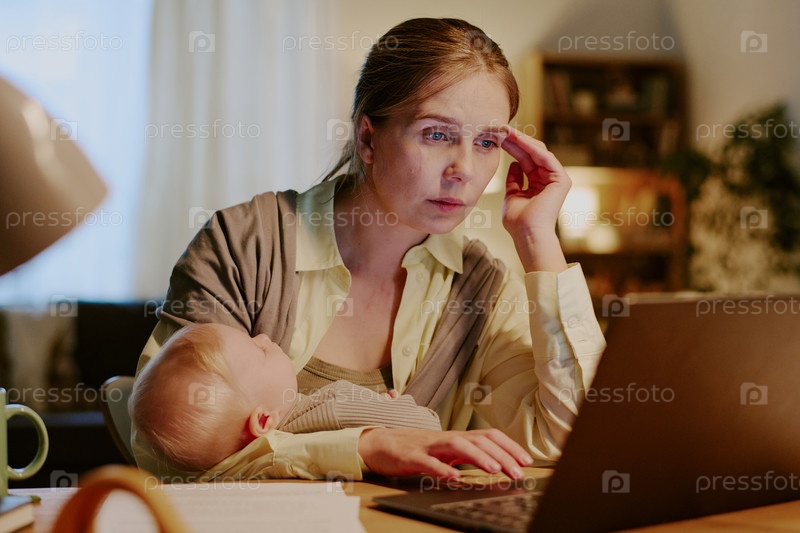 Портрет сосредоточенной женщины, заботящейся о ребенке во время работы
