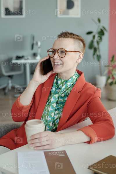 Бизнесвумен улыбается, разговаривая по мобильному телефону в офисе