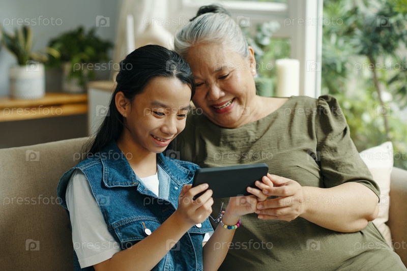 Девушка смотрит фото на смартфоне со своей бабушкой