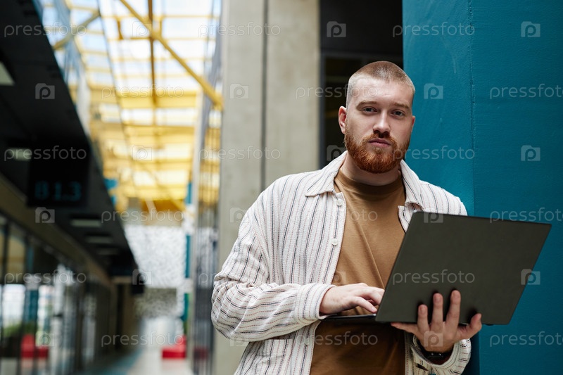 Взрослый мужчина держит ноутбук и смотрит на камеру, стоя в офисном центре