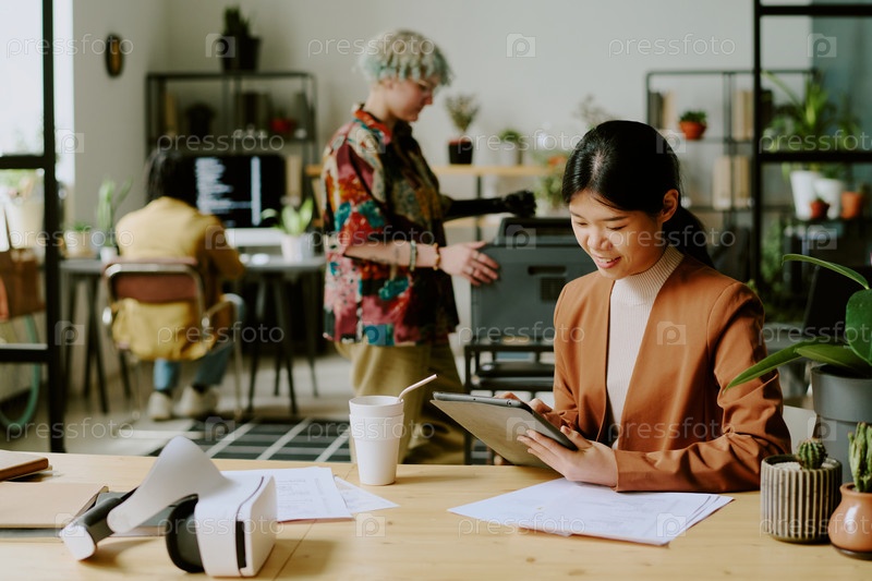 Азиатская женщина, использующая цифровой планшет на работе