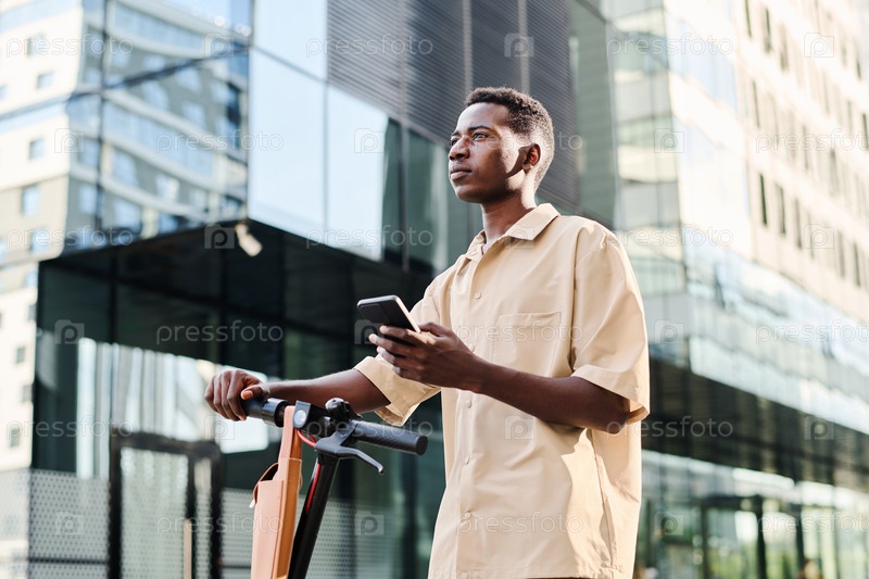 Молодой человек стоит с электрическим скутером на открытом воздухе