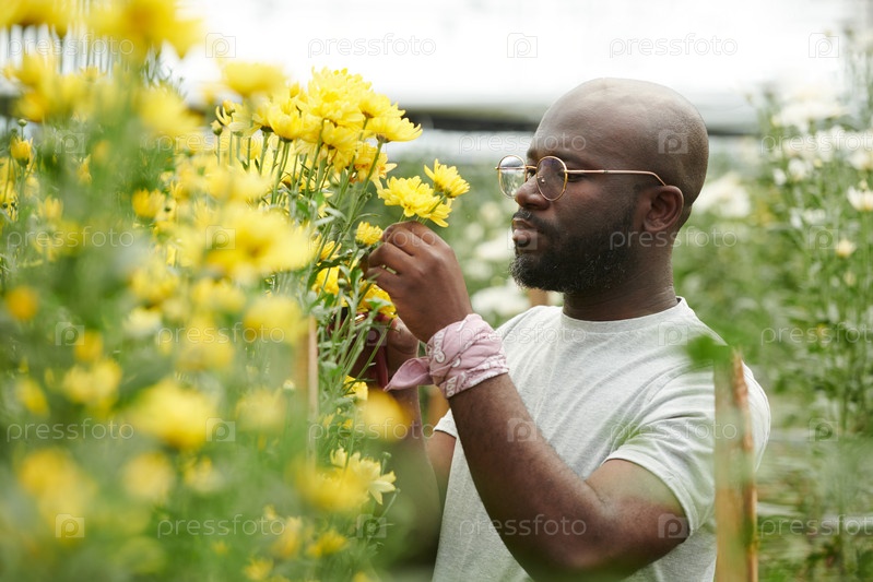 Черный мужчина ухаживает за цветами на плантации в теплице