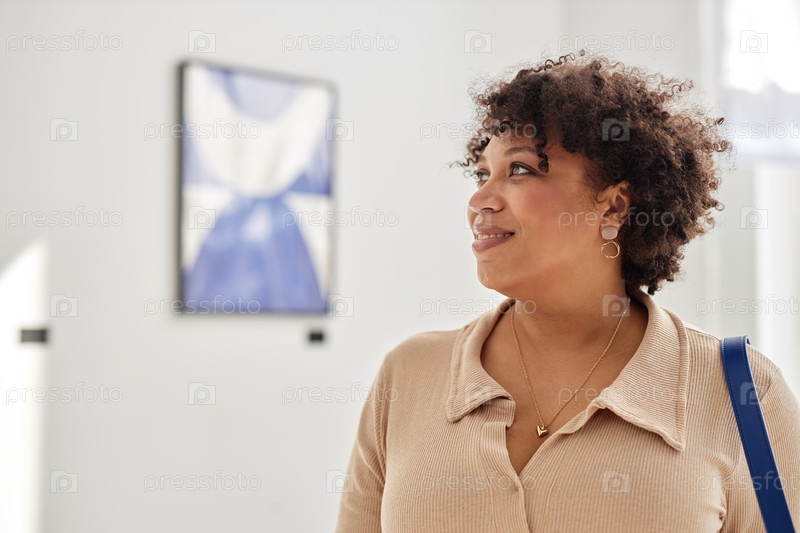 Счастливая афроамериканская женщина смотрит на картины в художественной галерее