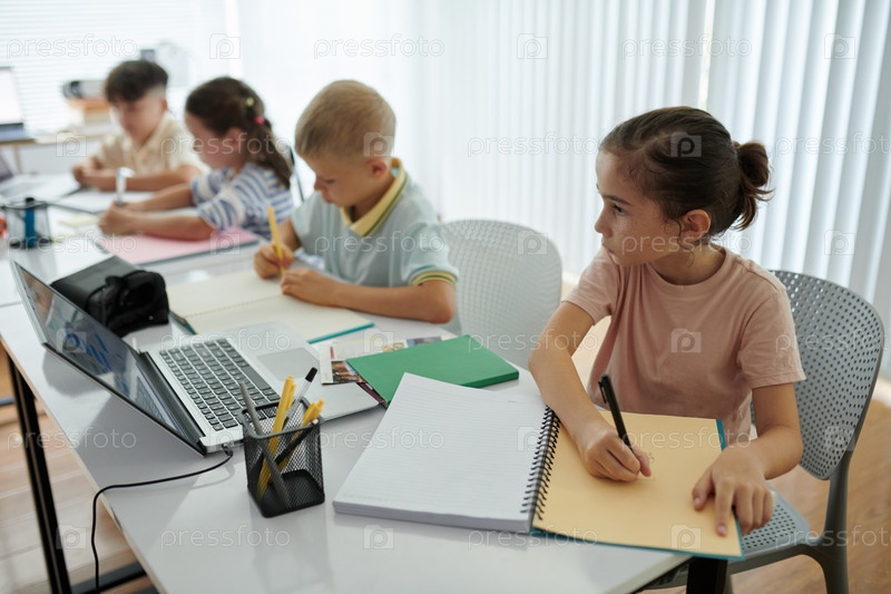 Дети пишут в классе с помощью тетрадей и карандашей