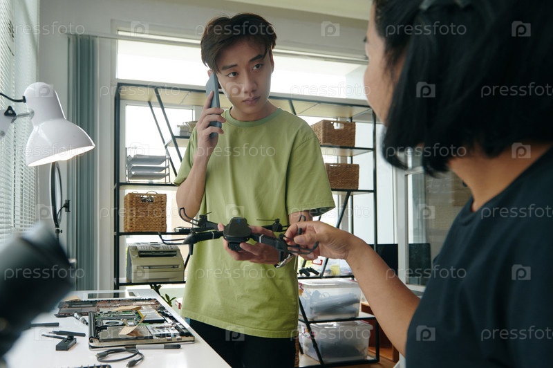 Коллеги, ремонтирующие беспилотные летательные аппараты в команде