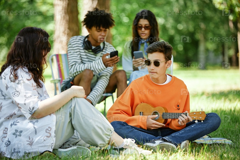 Мальчик-подросток в солнцезащитных очках играет на укулеле, сидящий на траве в парке