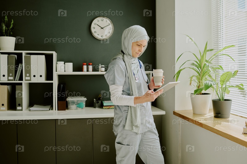 Медсестра в медицинском кабинете держит планшет и чашку кофе
