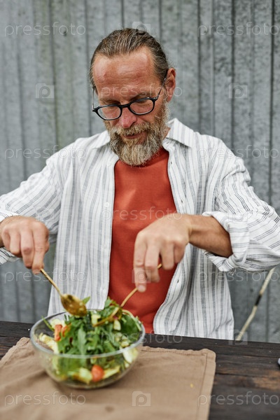 Бородатый мужчина в непринужденном наряде смешивает салат Здоровый обед в кафе