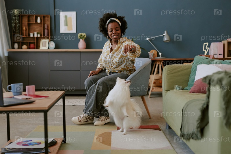 Взаимодействие с домашним питомцем в современной обстановке гостиной