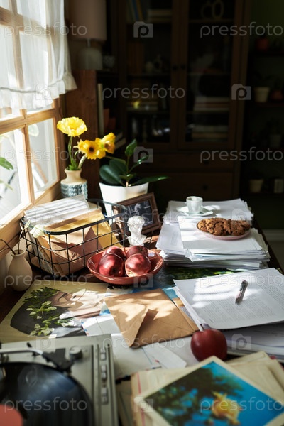 Уютный офисный стол с бумагами и фруктами в утреннем свете