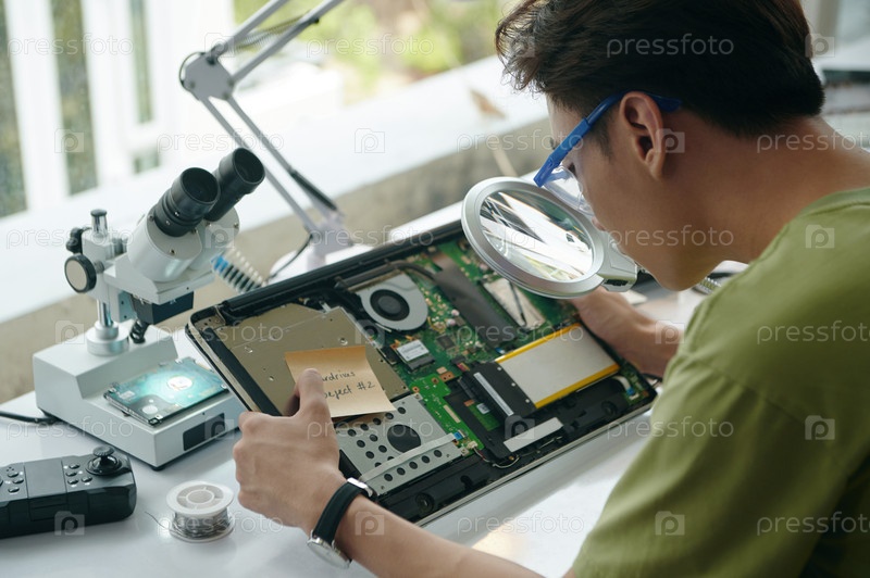 Ремонтник использует увеличитель на своей работе