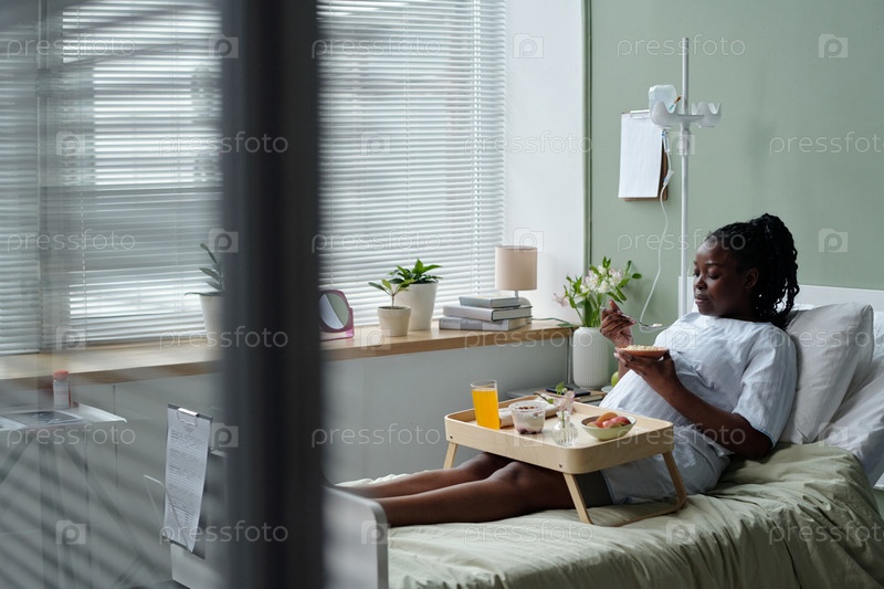 Восстанавливающийся пациент наслаждается едой в больничной спальне