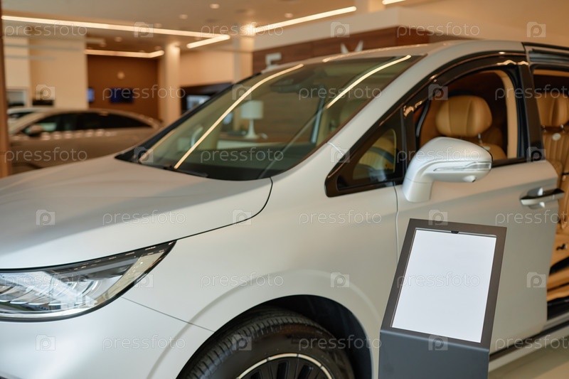 Демонстрационный автомобиль черного цвета SUV рядом с информационным стендом Mockup в дилерском центре
