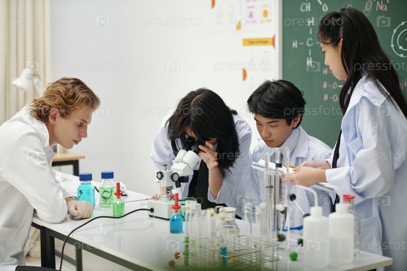 Студенты проводят научный эксперимент в лаборатории химии