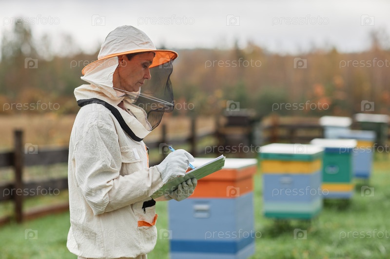 Пчеловод средних лет в костюме Письмо в блокноте на Апиарной ферме