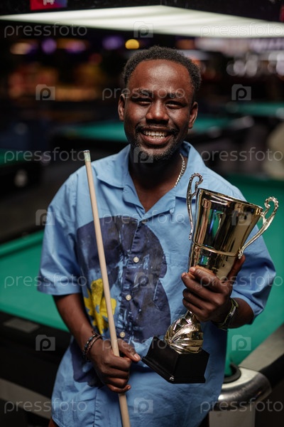 Улыбающийся человек, держащий трофей по бильярдному столу