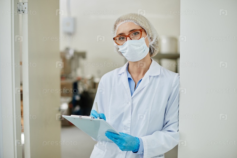 Портрет технологического процесса в маске, держащей блокнот на фармацевтическом производстве