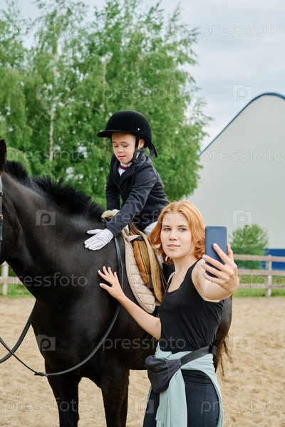 Снимаю селфи с ребенком, едущим на черном коне