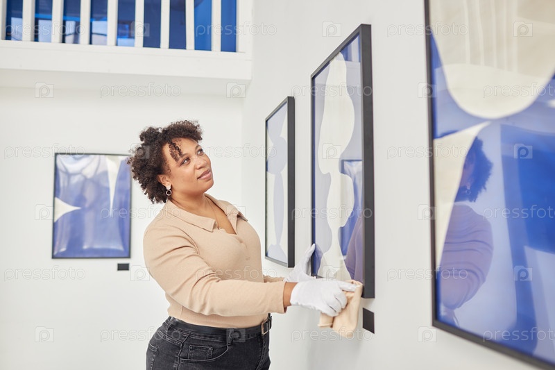 Счастливая чернокожая женщина устраивает картины в художественной галерее