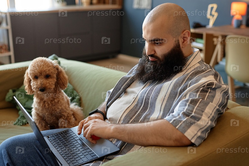 Он печатает на ноутбуке, в то время как собака внимательно следит за человеком
