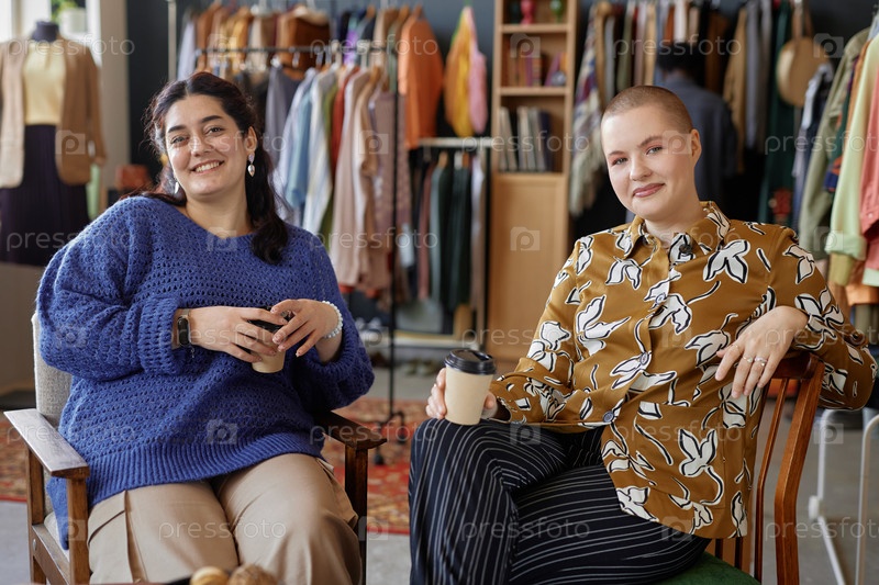 Две счастливые молодые женщины, улыбающиеся и позирующие перед камерой