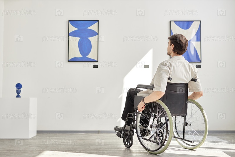 Обратный взгляд на человека, использующего инвалидное кресло и смотрящего картины в доступной художественной галерее