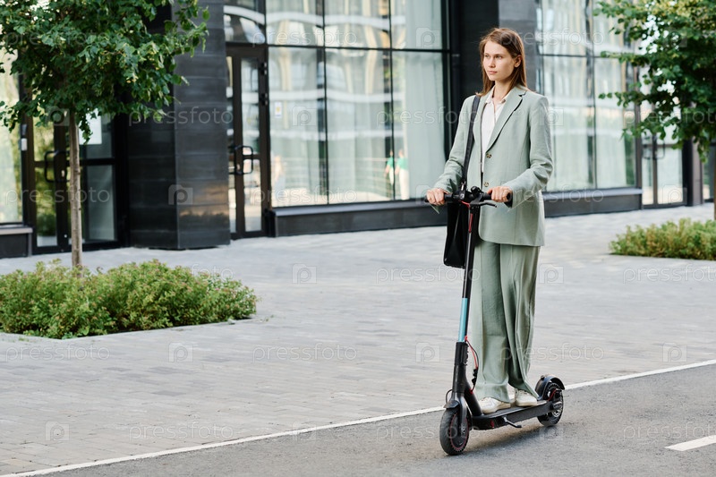 Женщина-менеджер Z Gen Getting To Work By E-scooter