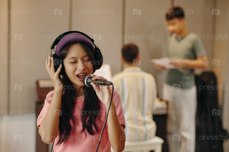 Певчая девушка записывает песню в музыкальной студии