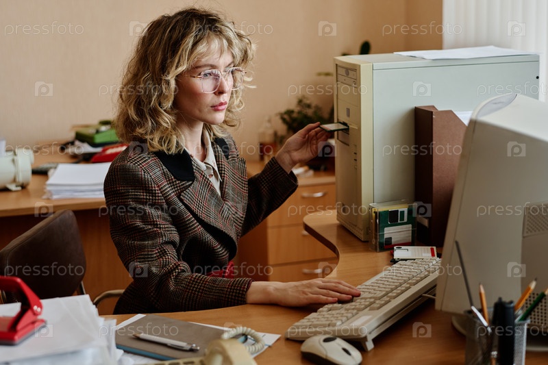 Портрет женщины, использующей компьютер в офисе Рабочий стол
