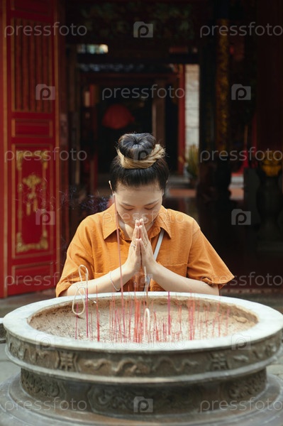Азиатская женщина молится в старом храме