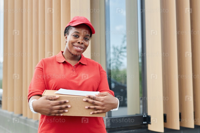 Улыбающаяся женщина держит пакет в красной форме
