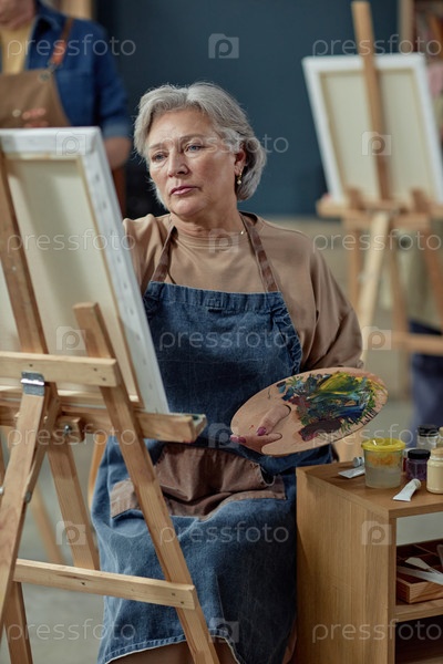 Зрелая женщина рисует и держит палитру