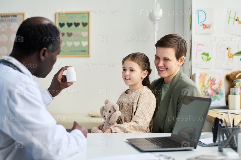 Врач показывает лекарства матери и дочери в кабинете