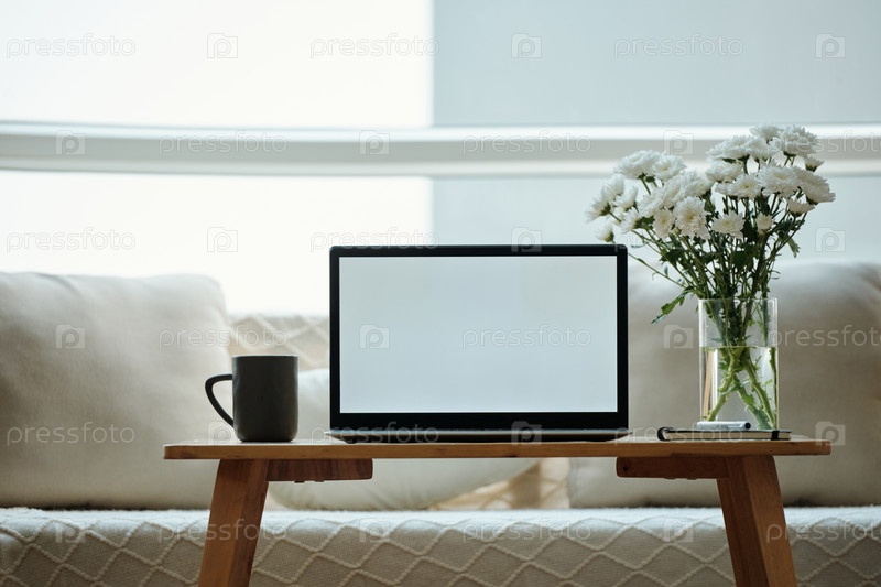 Кофейный стол с ноутбуком и букетом