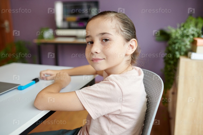 Портрет улыбающейся девочки, сидящей за столом в классе