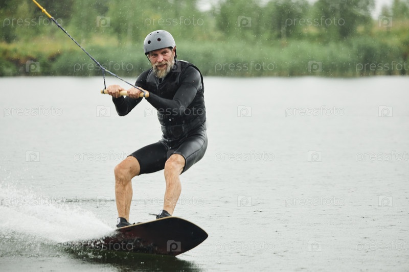 Бородатый мужчина Wakeboarding на озере воды перемещаясь к камере