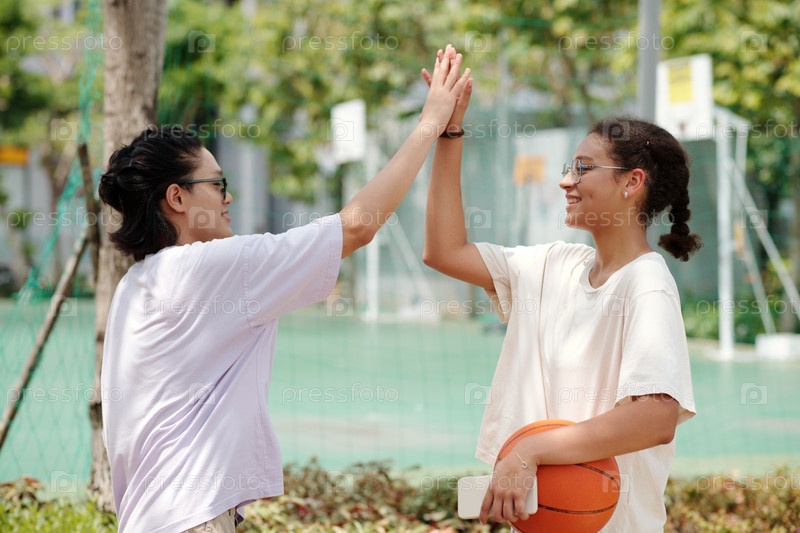 Празднование успеха с высокой пятой на баскетбольной площадке
