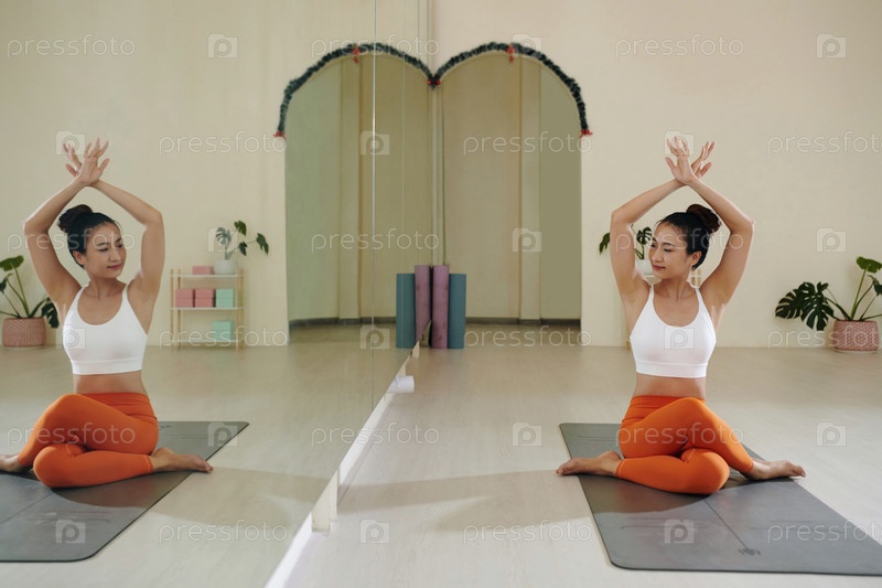 Практика йоги в современной студии с большим зеркалом
