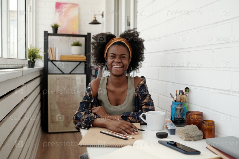 Улыбающаяся женщина, сидящая за офисным столом с припасами