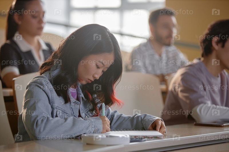 Фокусированная студентка-женщина делает заметки во время лекции в колледже