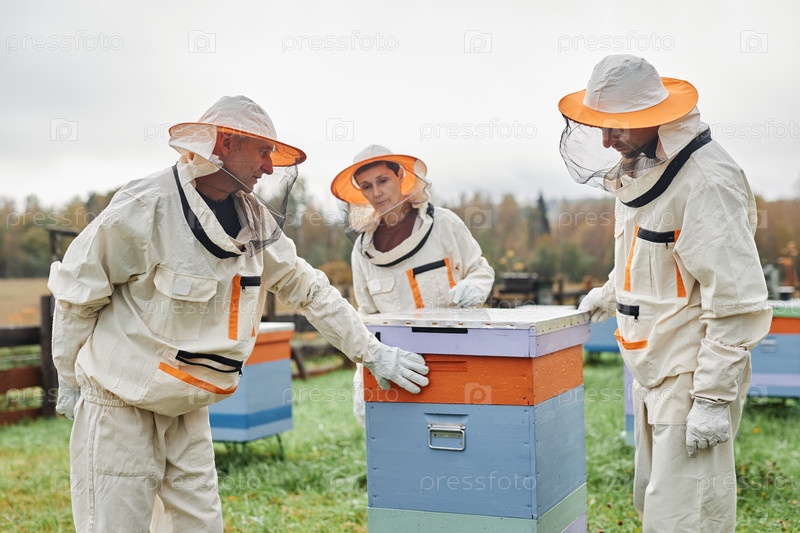 Три пчеловода в костюмах во время проверки улья на Апиарной ферме