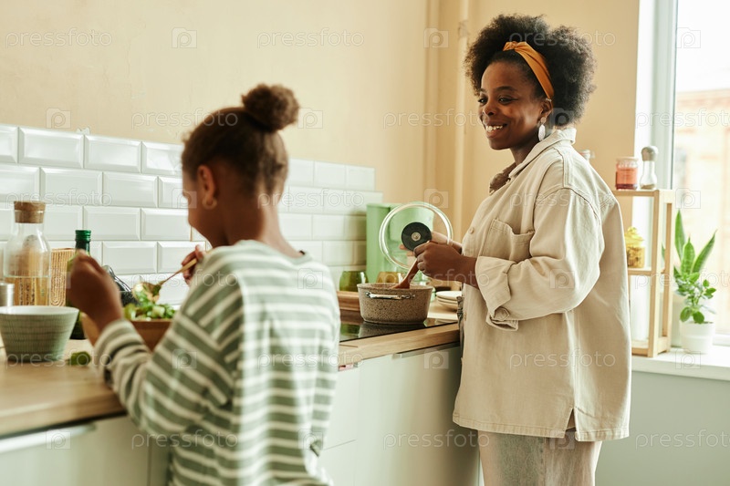 Чернокожая женщина готовит на плите, глядя на девушку с любовью в кухне