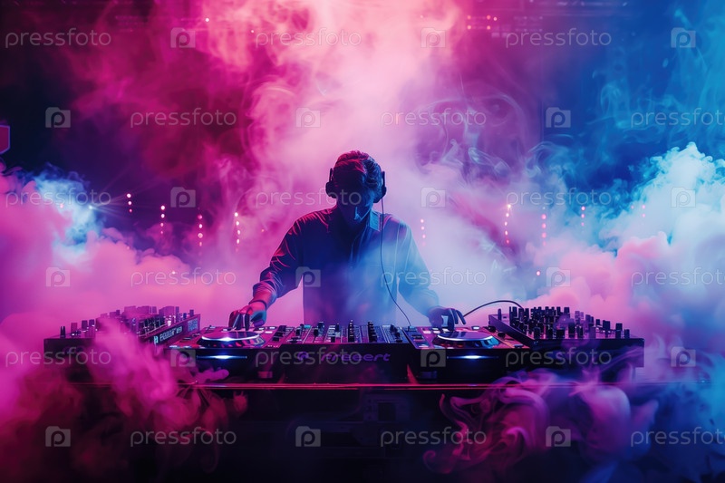Выступающий ди-джей в ночном клубе, окруженный красочным дымом