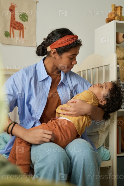 Опекающая мать утешает ребенка в уютной спальне