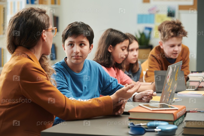 Мальчик разговаривает с учителем во время урока компьютера